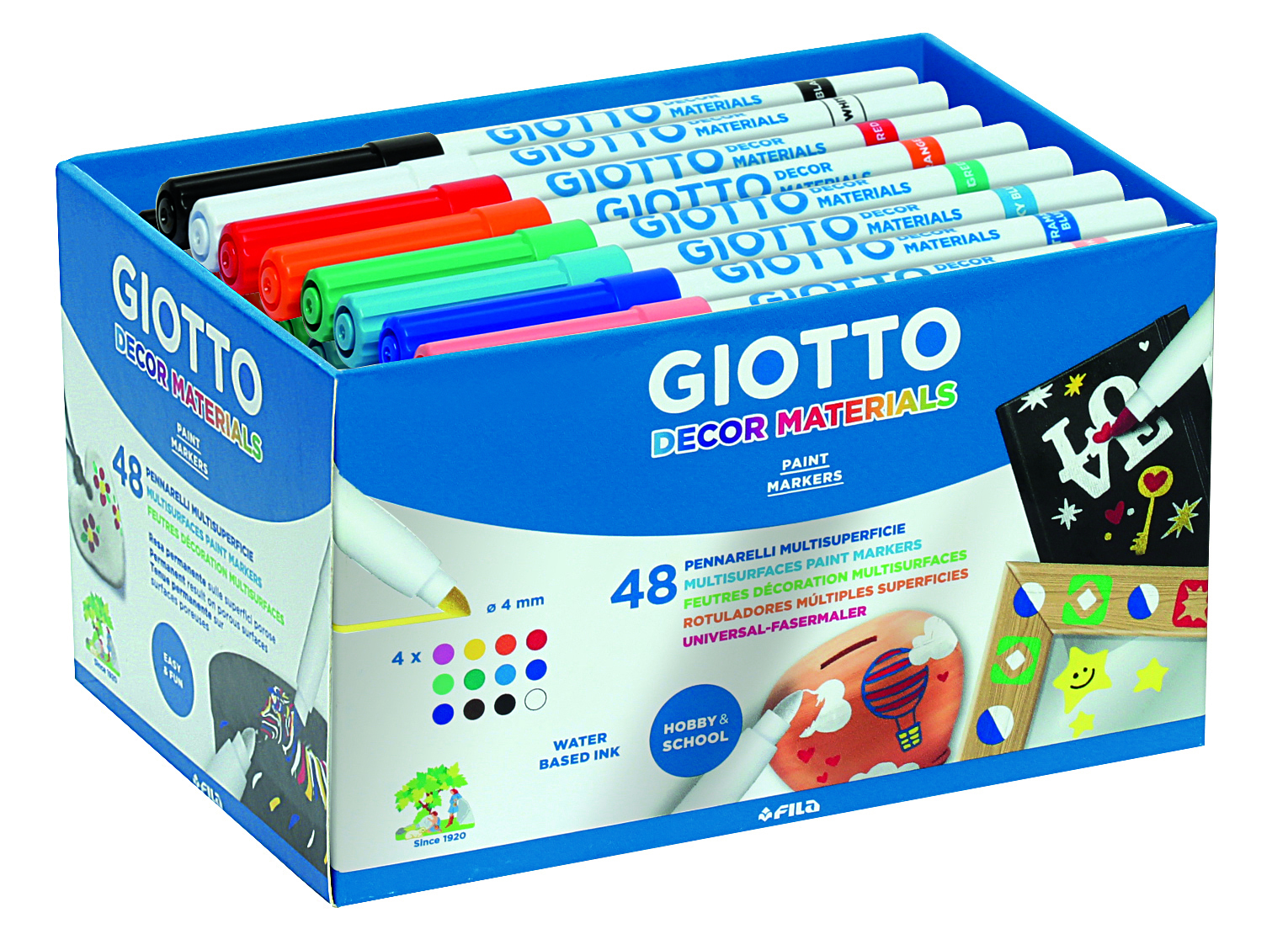 Veľké balenie dekoračných fixiek Giotto na všetky typy povrchov, farba má super kryciu silu. Permanentné a nezmyteľné na poróznych povrchoch ( kameň, drevo, guma).