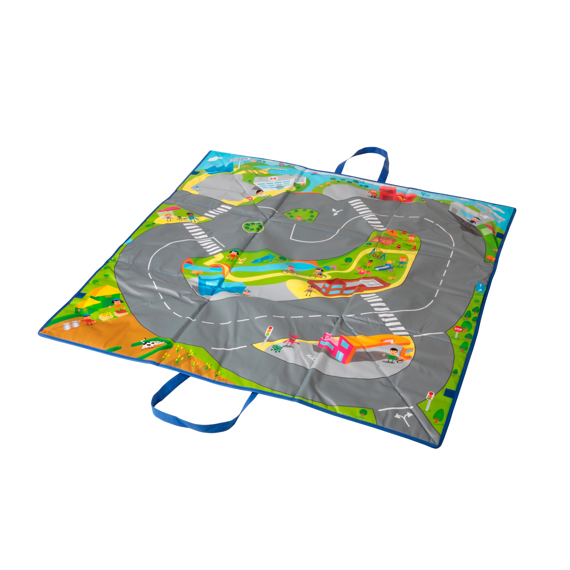 Vzdelávacia hra zameraná na výchovu detí k rešpektovaniu bezpečnosti na cestách. Ľahko prenosné a využiteľné dopravné ihrisko, ktoré je ideálne na hranie s hračkami: Autíčka – Povolania a Dopravné značky.