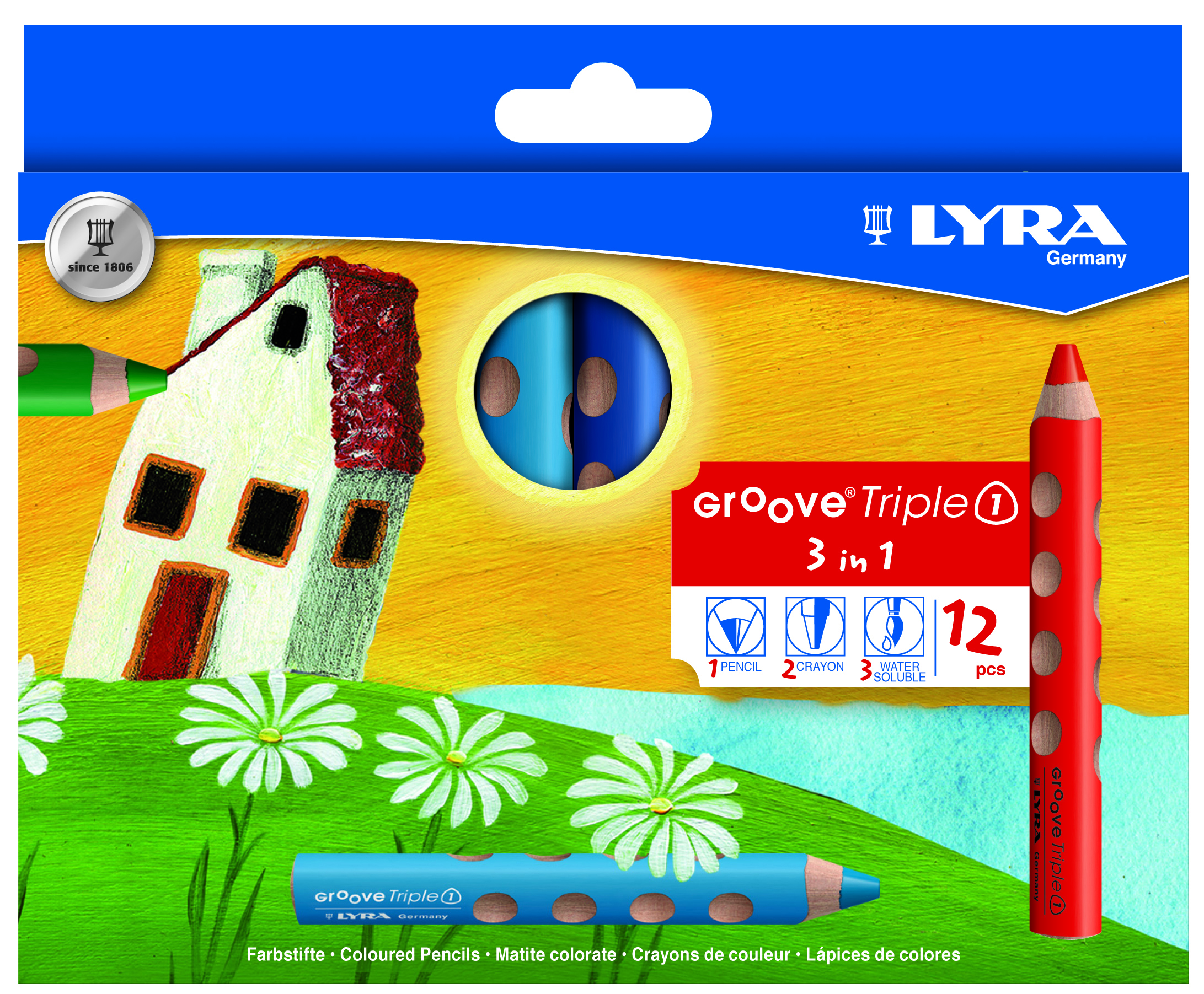 Akvarelová pastelka/vodová farba, farebná ceruzka a voskovka v jednej pastelke – žiarivé a jemné farby pre pravákov aj ľavákov. K zastrúhaniu odporúčame vybrať Strúhadlo na farbičky 3 v 1.