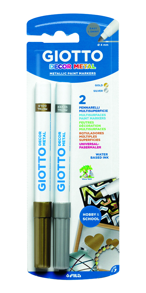 Metalické fixky Giotto s ideálnymi vlastnosťami pre kreslenie na papier, kovy, drevo, umelú hmotu, kožu či sklo.