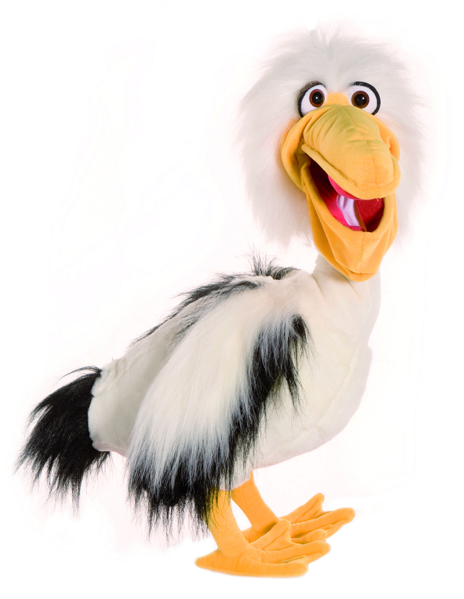 Hebká a roztomilá maňuška pelikána na rozviazanie detského jazýčka s pohyblivými ústami a hlavou.